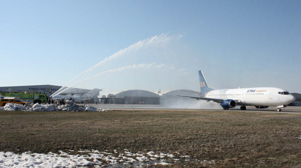 Wichita Fire Department and Mid-Continent employees give departing Wichita State University charter jet a water cannon salute. Courtesy Mid-Continent Airport.
