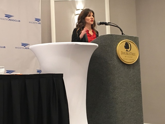 It fell to colleague Ashley Bowen Cook, Wichita Aero Club vice chairperson, to announce this year’s trophy winner: former Wichitan Clay Lacy.
