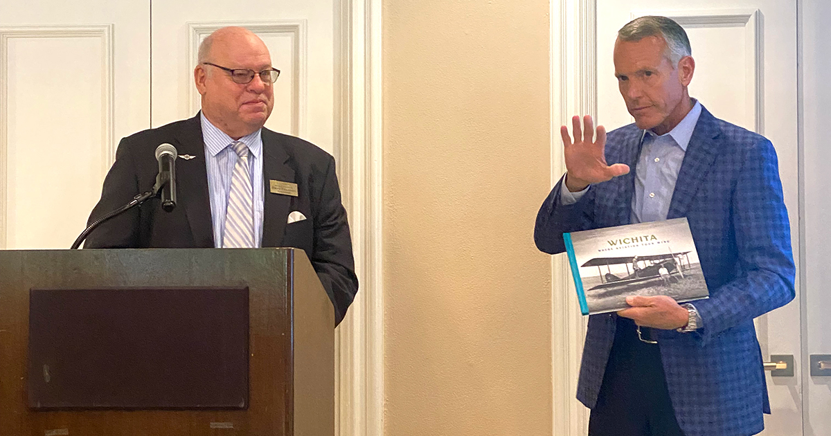 Wichita Aero Club President Dave Franson gave FlightSafety CEO Brad Thress a copy of Greteman Group’s book — Wichita: Where Aviation Took Wing — as a presentation thank you. Thress ought to like it. He’s played a significant role in the Air Capital’s history.