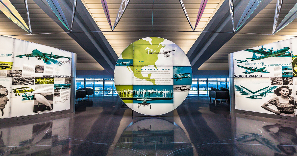 Greteman Group-designed environmental graphics along the walls include everything from a teepee with traditional Plains tribe icons to a dream shield. Photographs laser-etched into granite personalize the exhibit with the noble visages of the men and women who made history here. Metalwork and limestone sculptures crafted by Todd Whipple and Chris Brunner showcase workday tools, weapons, lodging and ornamentation. Eagles, bison, horses and turtles – all significant to the culture – figure prominently.